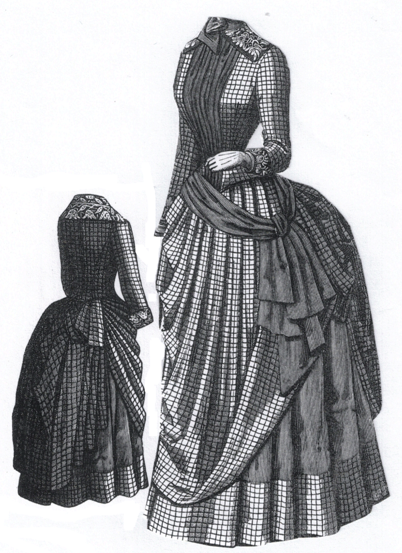 ground and red bars. Pattern consists of bodice, overskirt, foundation