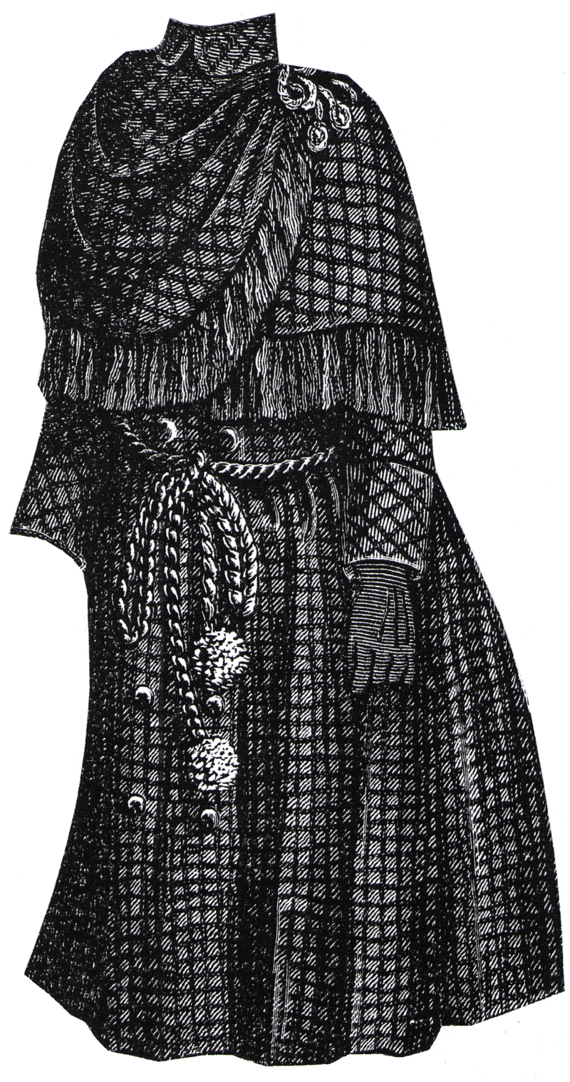plaid woolen. It has a cape which is draped on the left shoulder