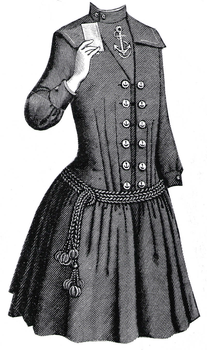 Gobelin blue serge; it is feather stitched with blue silk, and has an anchor