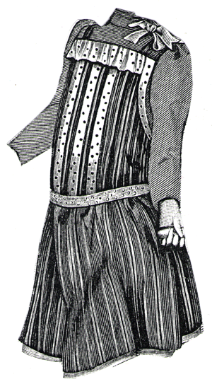 gingham or cambric, and was trimmed with light contrasting bands and buttons