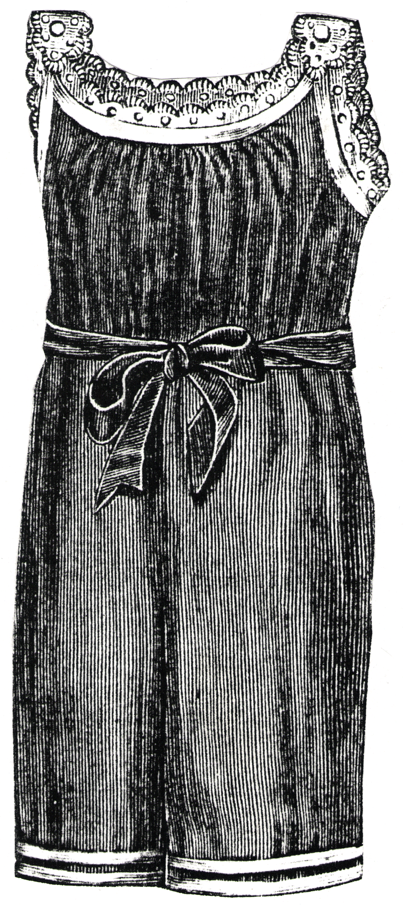 above the hem, joined to a gathered waist trimmed with lace insertion.