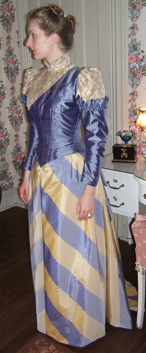 pink and gray Peau de Soie. It is made with a demi-trained skirt and a