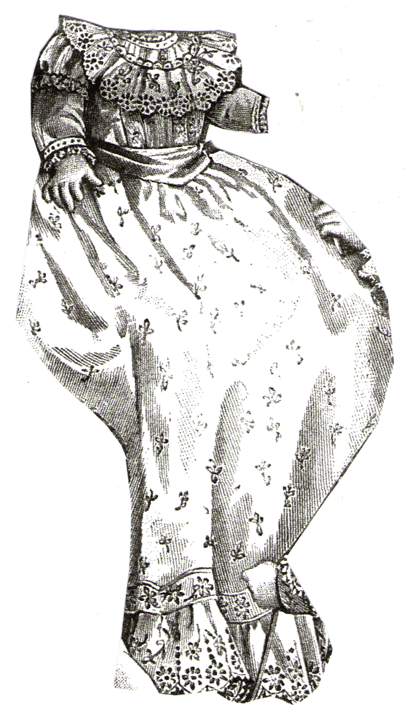 was made of embroidered Nainsook with the skirt trimmed at the bottom with a