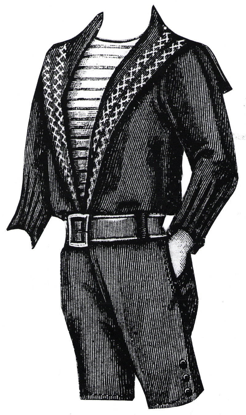 knee trousers and a sailor blouse of navy blue serge, the blouse opening on