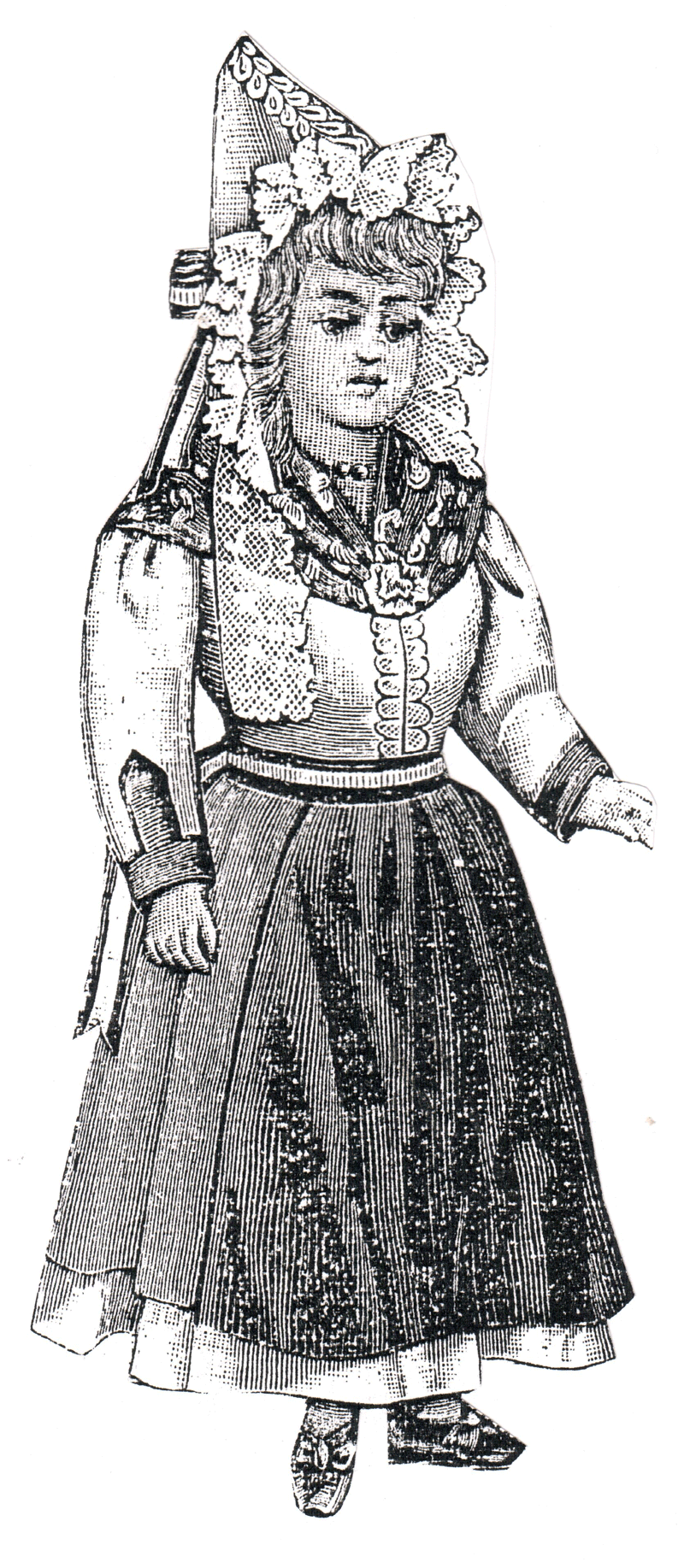 cashmere trimmed with narrow silver lace. Pattern consists of bodice, skirt and cap.