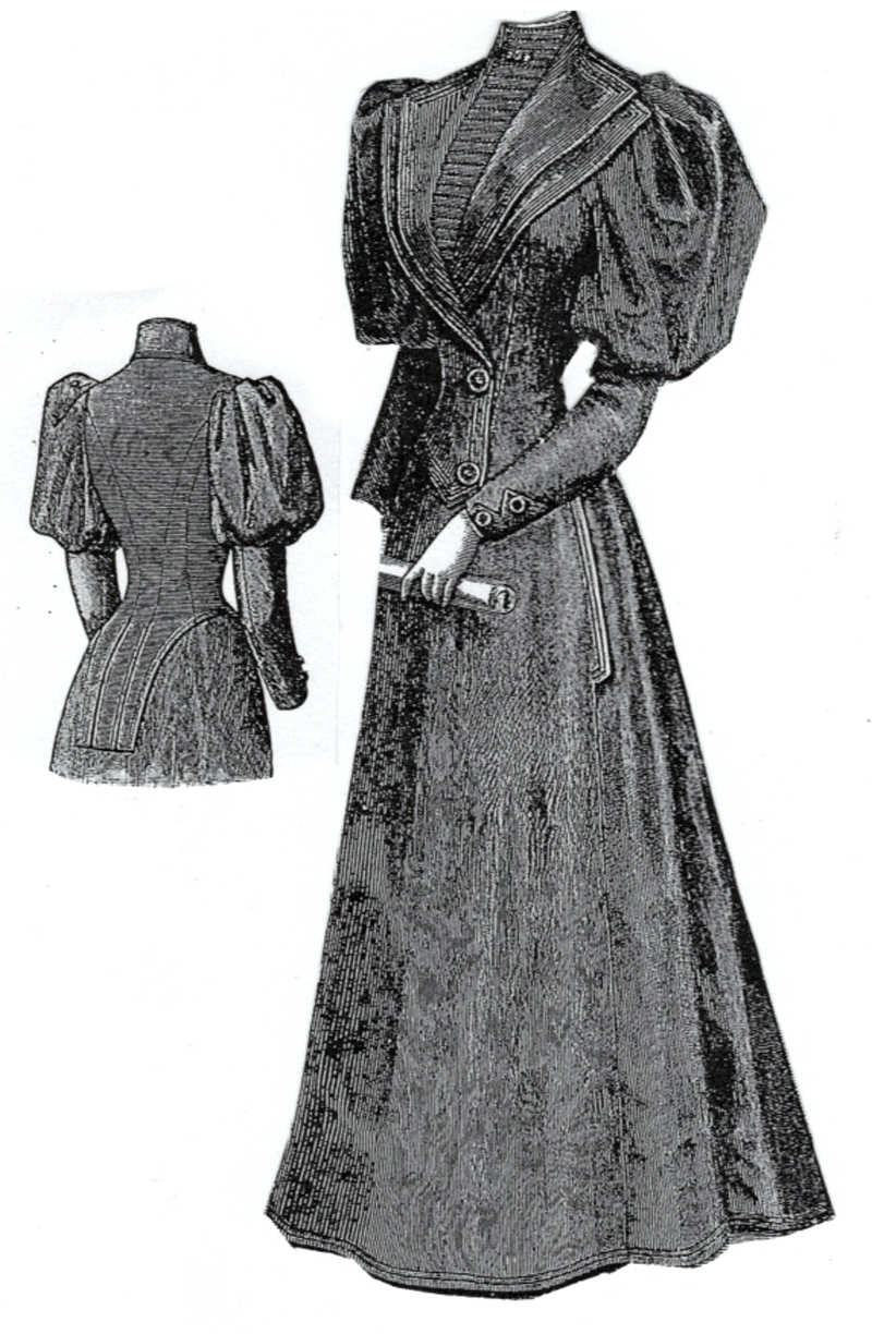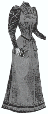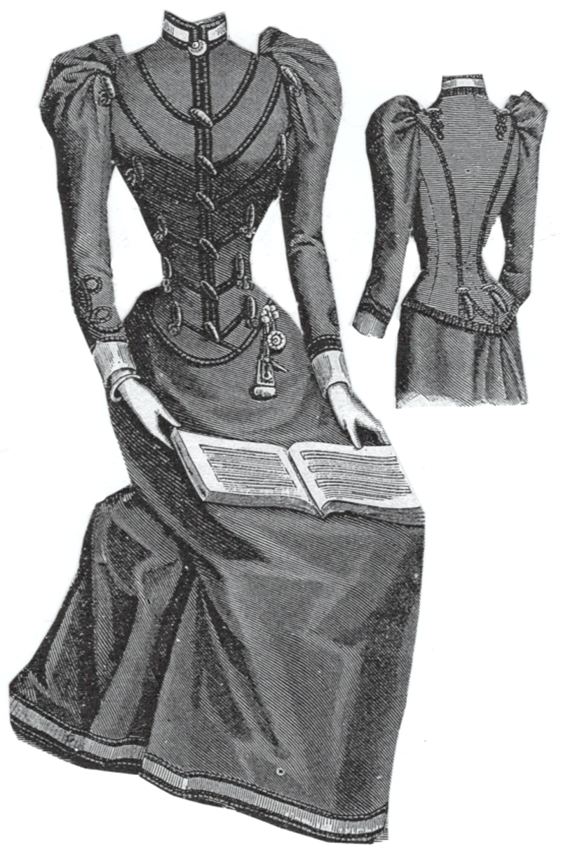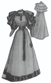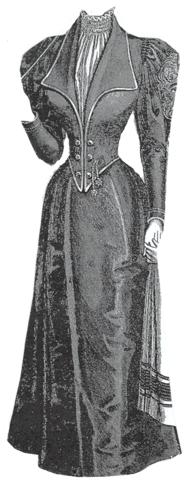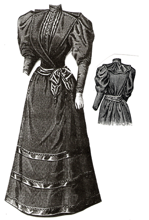 BLUE CHEVIOT, WITH A PUFFED GUIMPE AND SLEEVE PUFFS OF BLACK SATIN, AND FOR