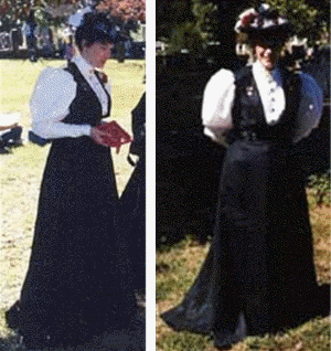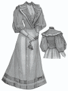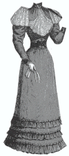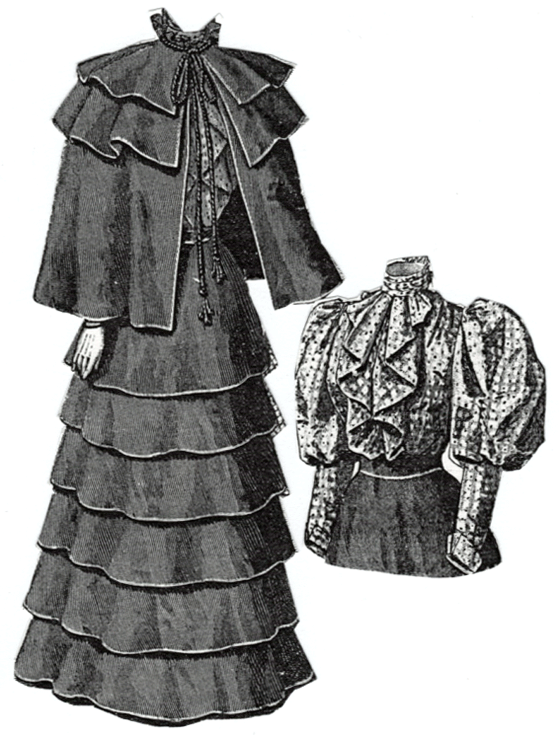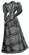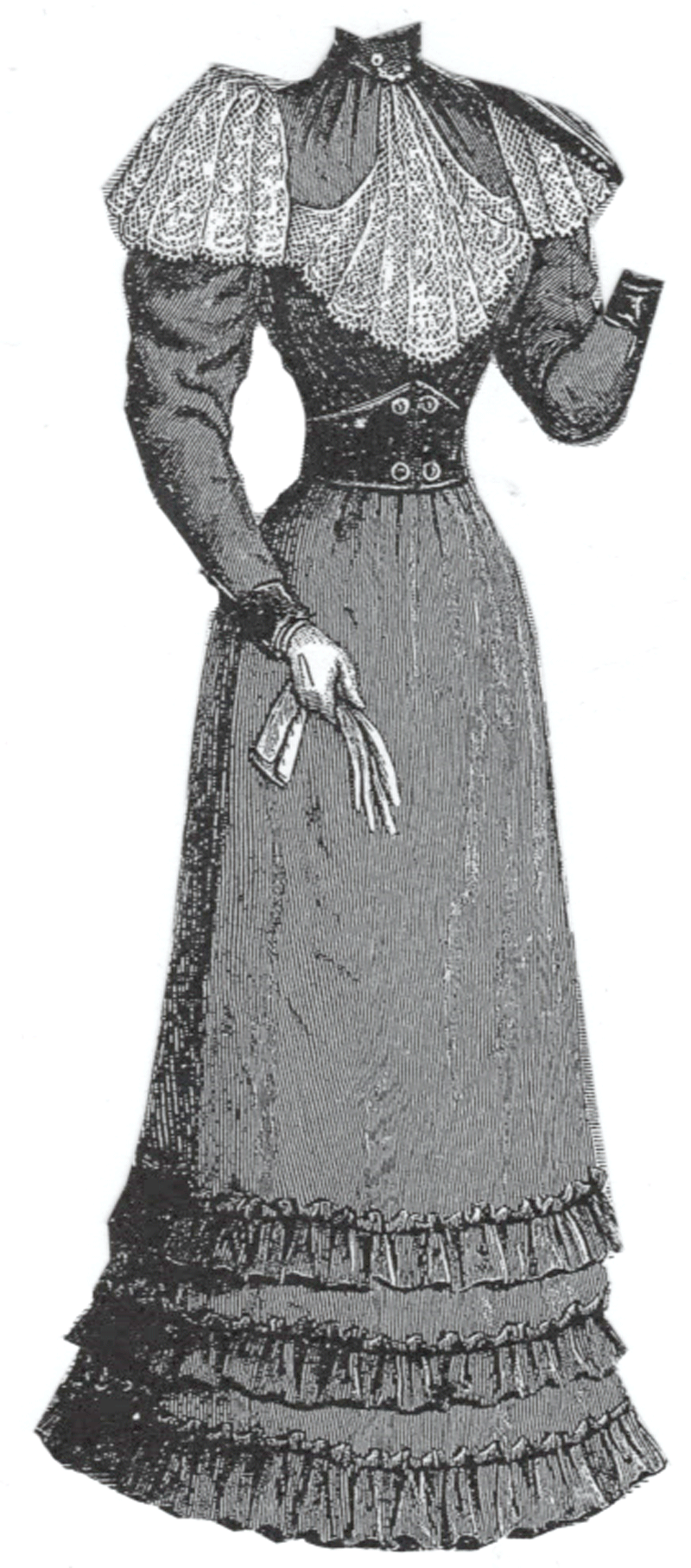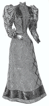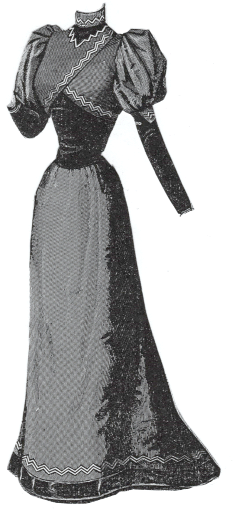 BLUE CHEVIOT, WITH A PUFFED GUIMPE AND SLEEVE PUFFS OF BLACK SATIN, AND FOR