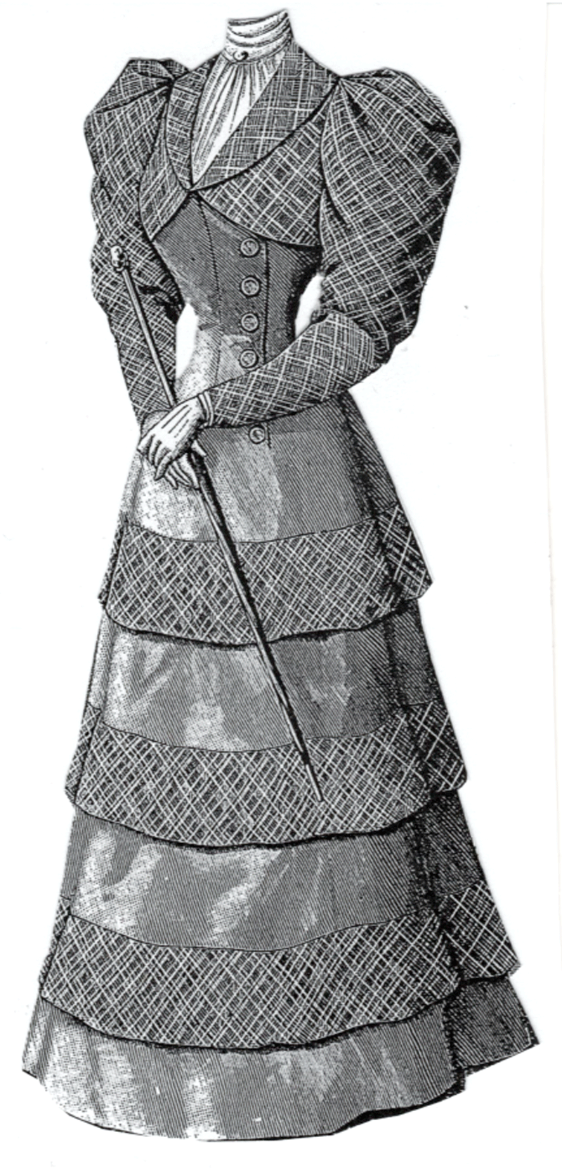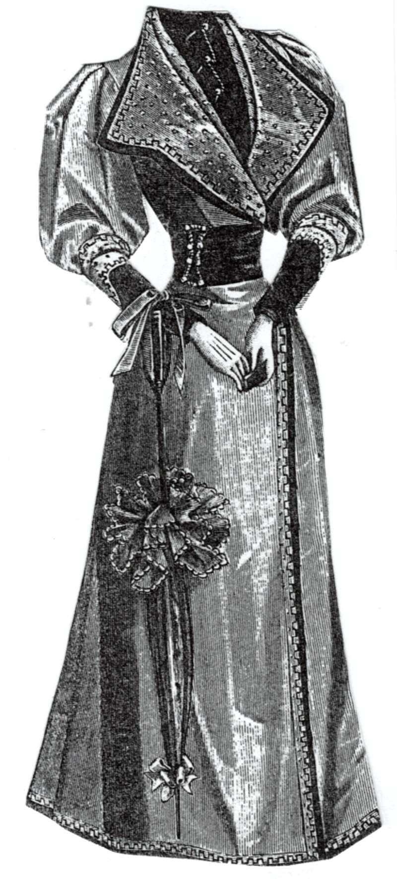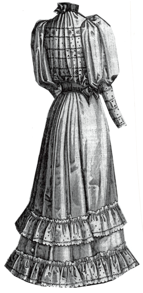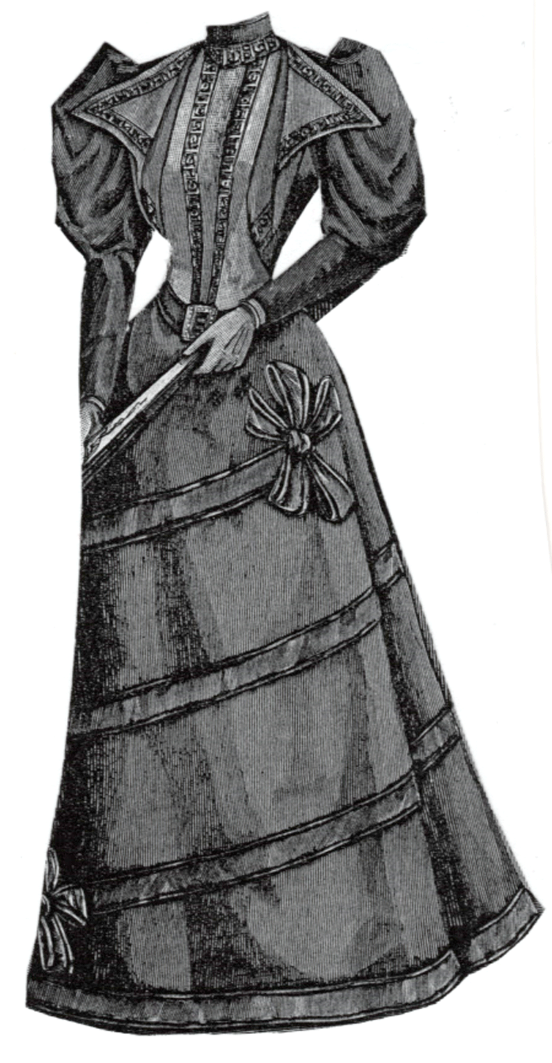 RIBBON. THE SKIRT IS CUT IN THE NEW ENGLISH BELL SHAPE.