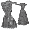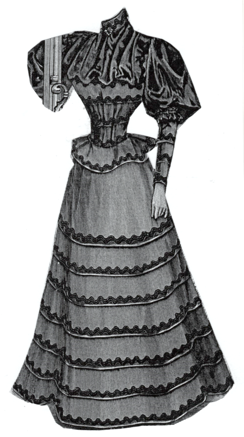 BLACK CORD GIMP. THE SKIRT HAS A BROAD FRONT BREADTH AND A BACK WHICH