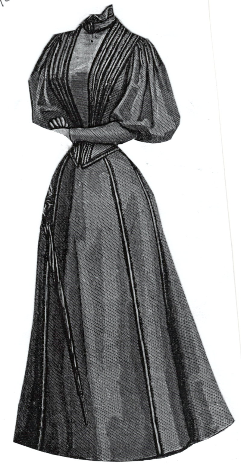 THE GOWN ILLUSTRATED IS OF BLUE-GRAY DIAGONAL, WITH BLACK