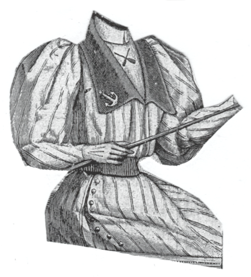 THE BLOUSE IS OF WHITE SERGE WITH A VEST OF RED AND WHITE