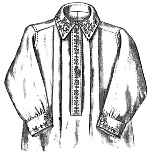 shirting muslin, and ornamented on the front, collar, and wristbands with a