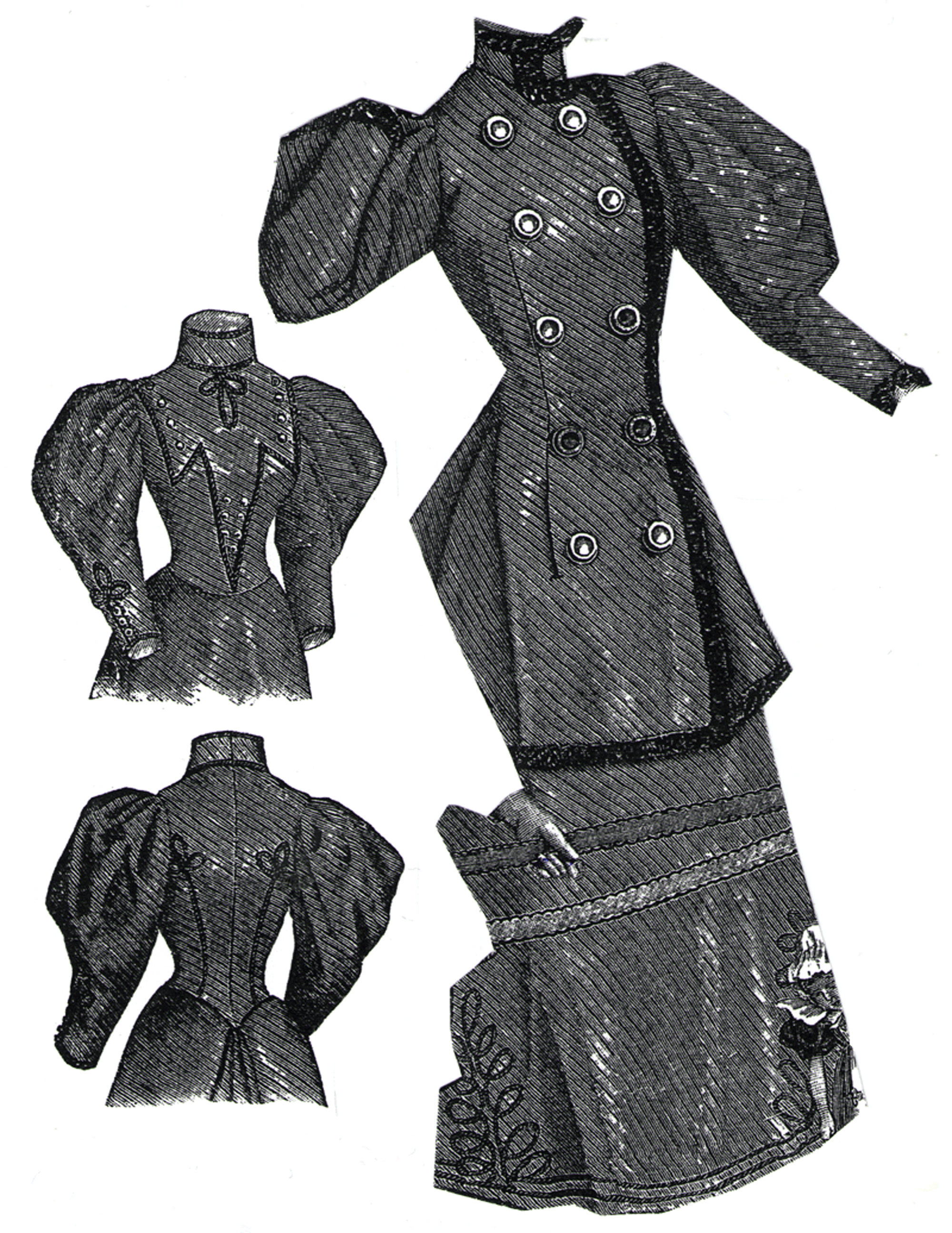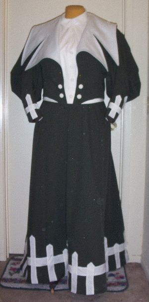 the waiter jacket, and a "fence post" trimming around the skirt. The