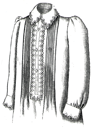with passementerie, and revers, collar and cuffs of the same plain cloth.