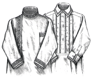 Russian style, with side fastening, is of white shirting muslin, trimmed