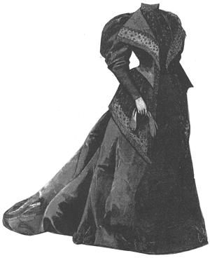 wool, trimmed with black silk cord and black satin ribbon, and relieved by a