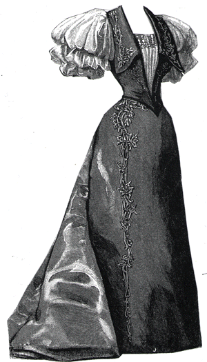 Reseda satin and figured cream silk was employed for this gown, which has a