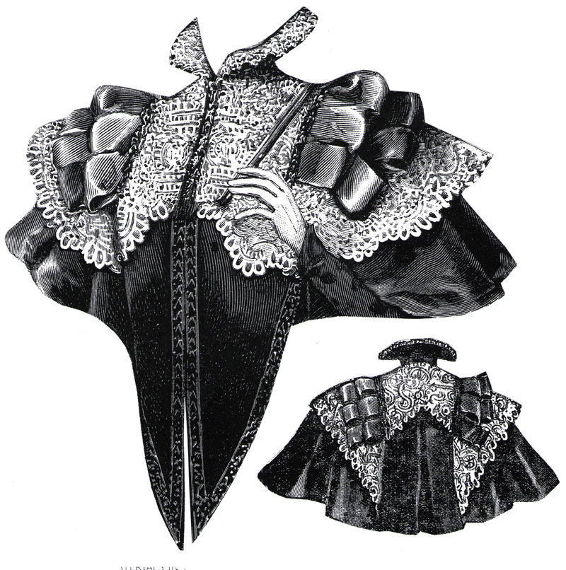 pointed fronts are edged with jet galloon, and the shoulders are trimmed