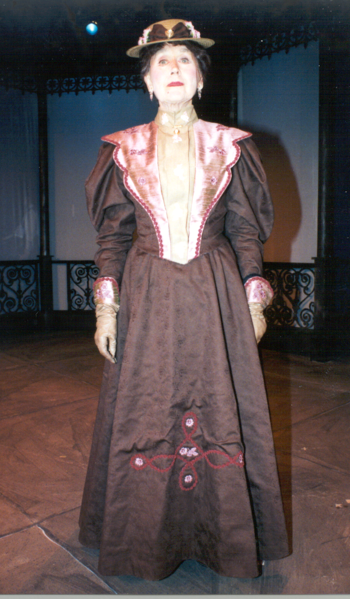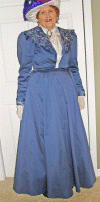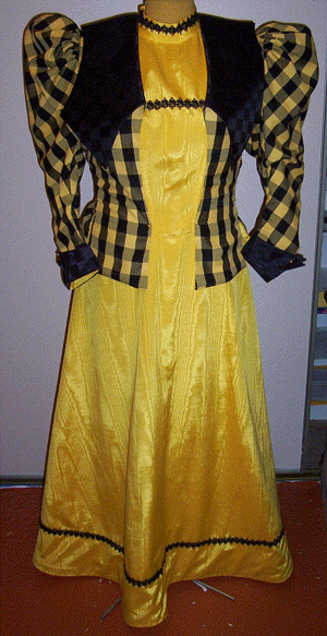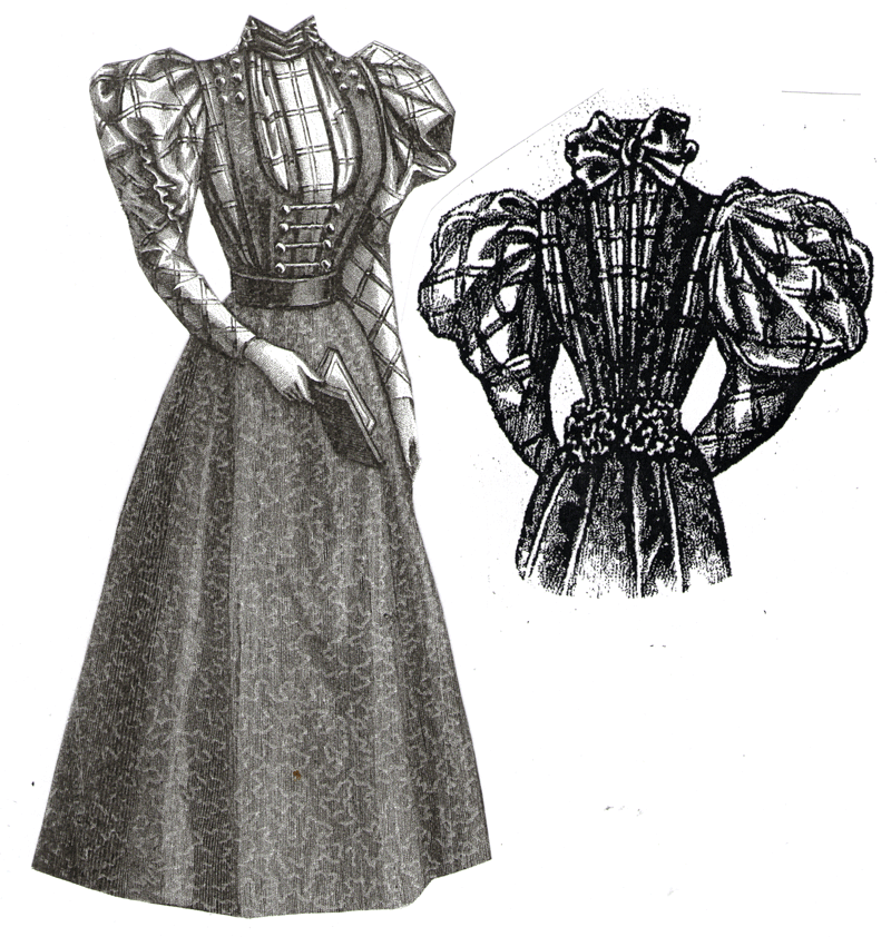 and green plaid silk waist with a skirt and bretelles of blue self-figured