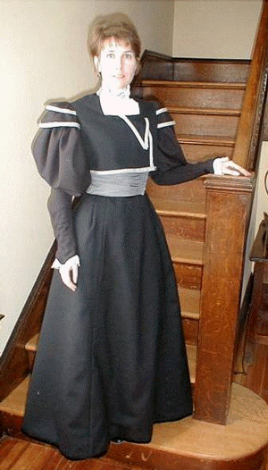 black striped wool, trimmed with narrow pinked ruches of black taffeta.