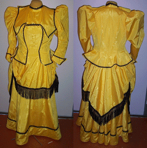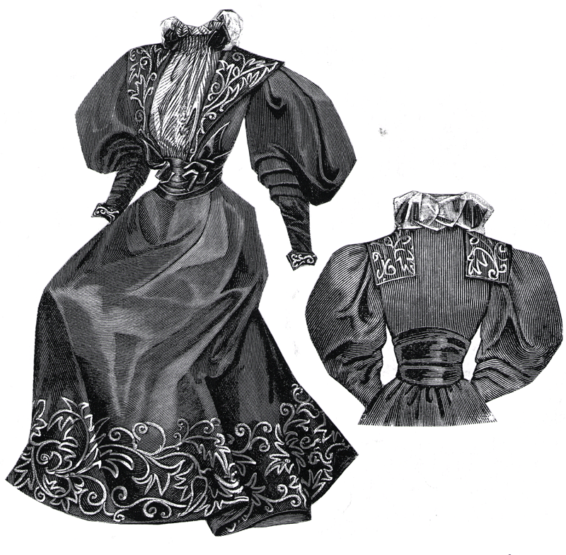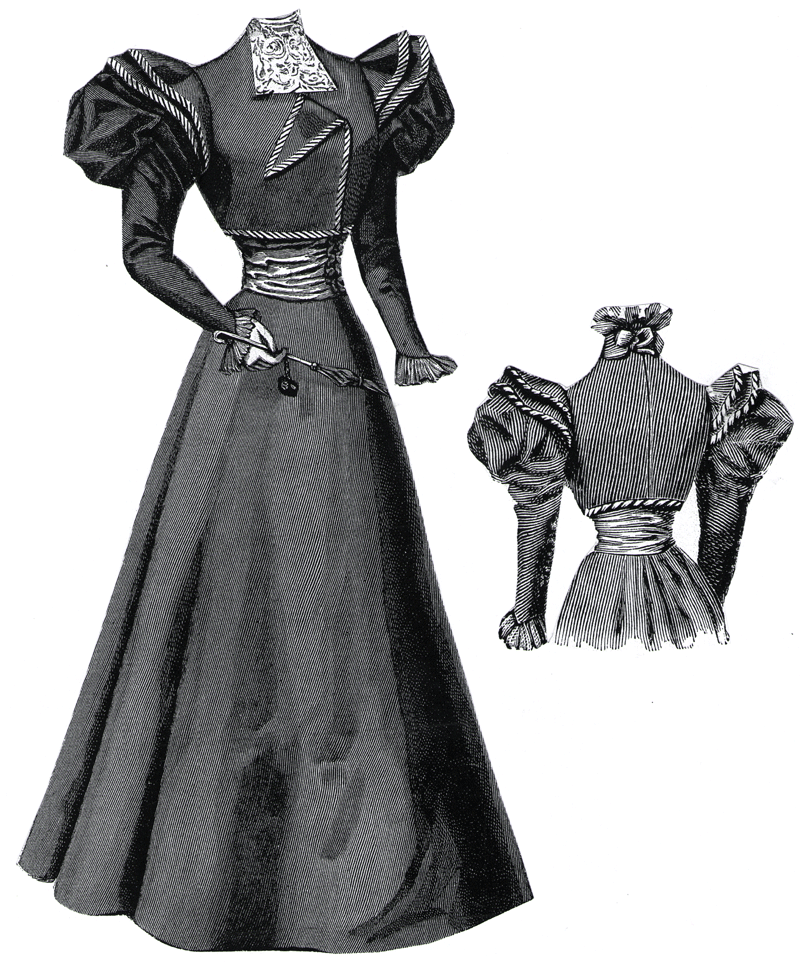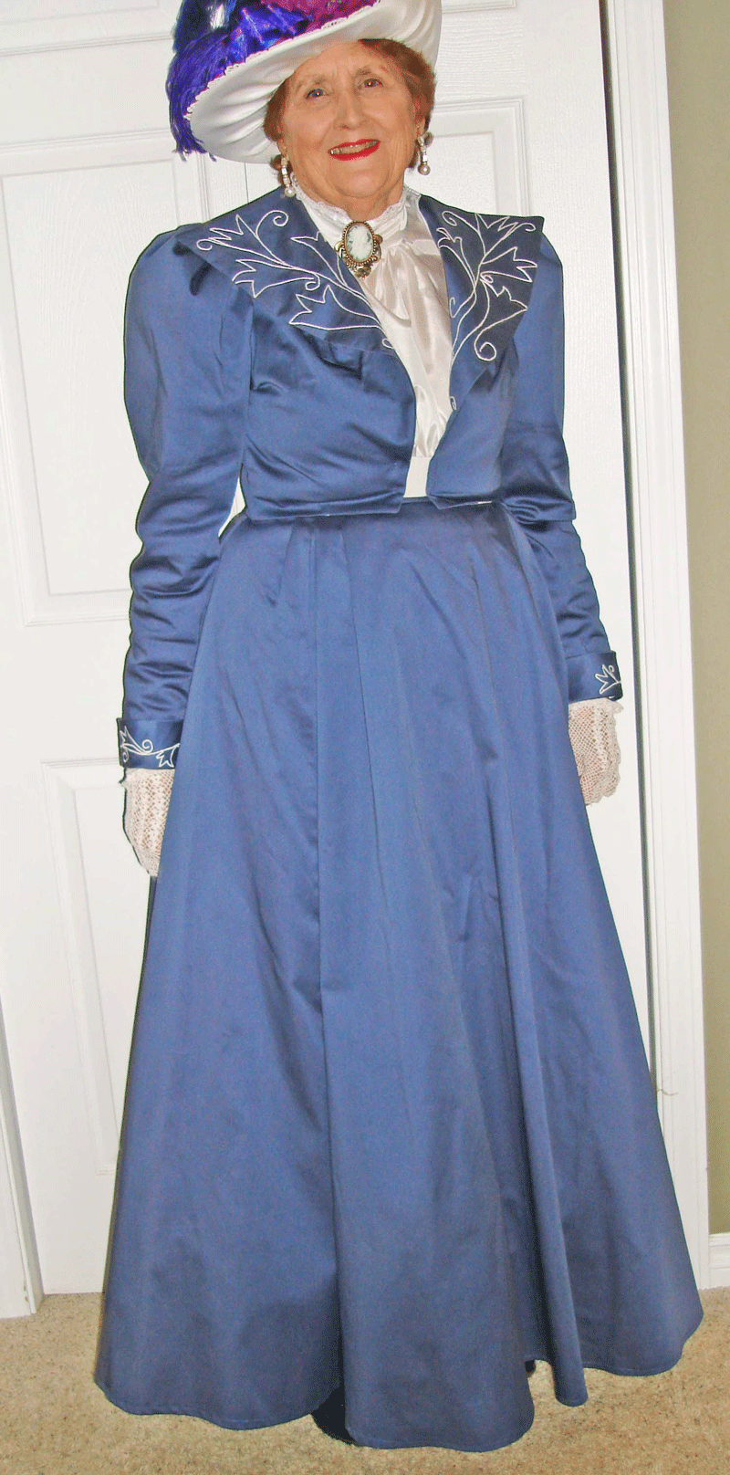 It has a plain gored skirt in six breadths. Pattern consists of jacket, vest and skirt.