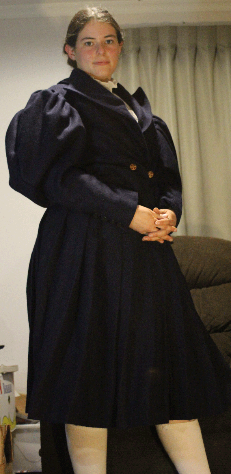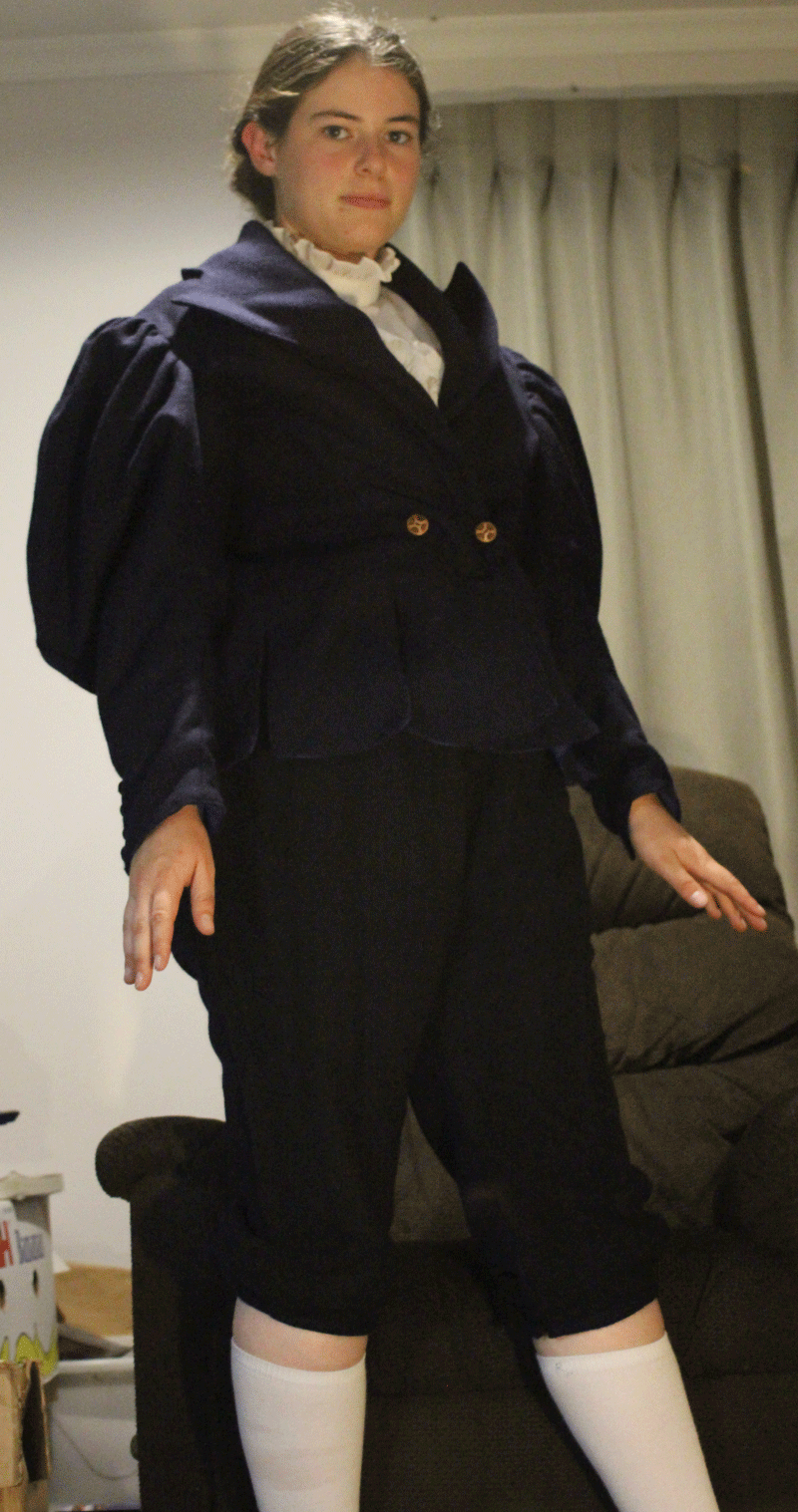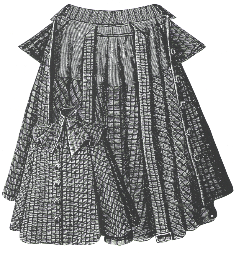 costume illustrated, which consists of a kilt skirt, a short slashed jacket
