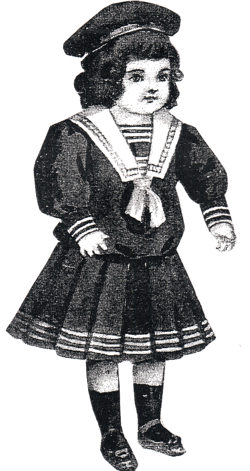 The doll is in a sailor suit of dark blue