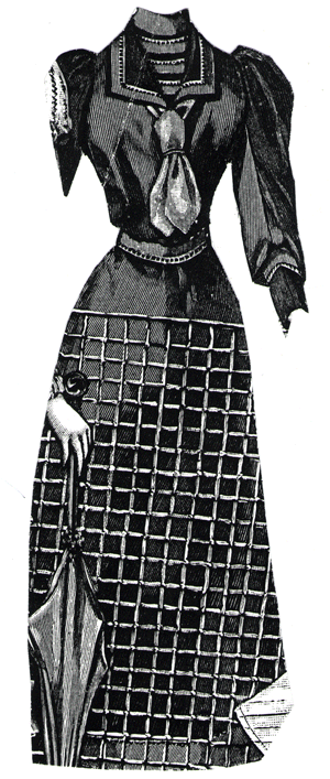 the gown illustrated, relieved by a band of red cloth. The bell skirt