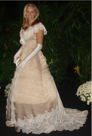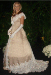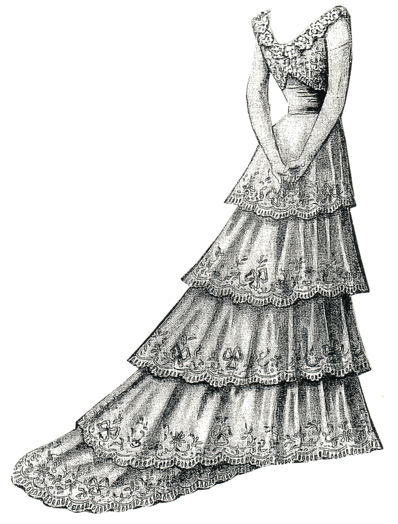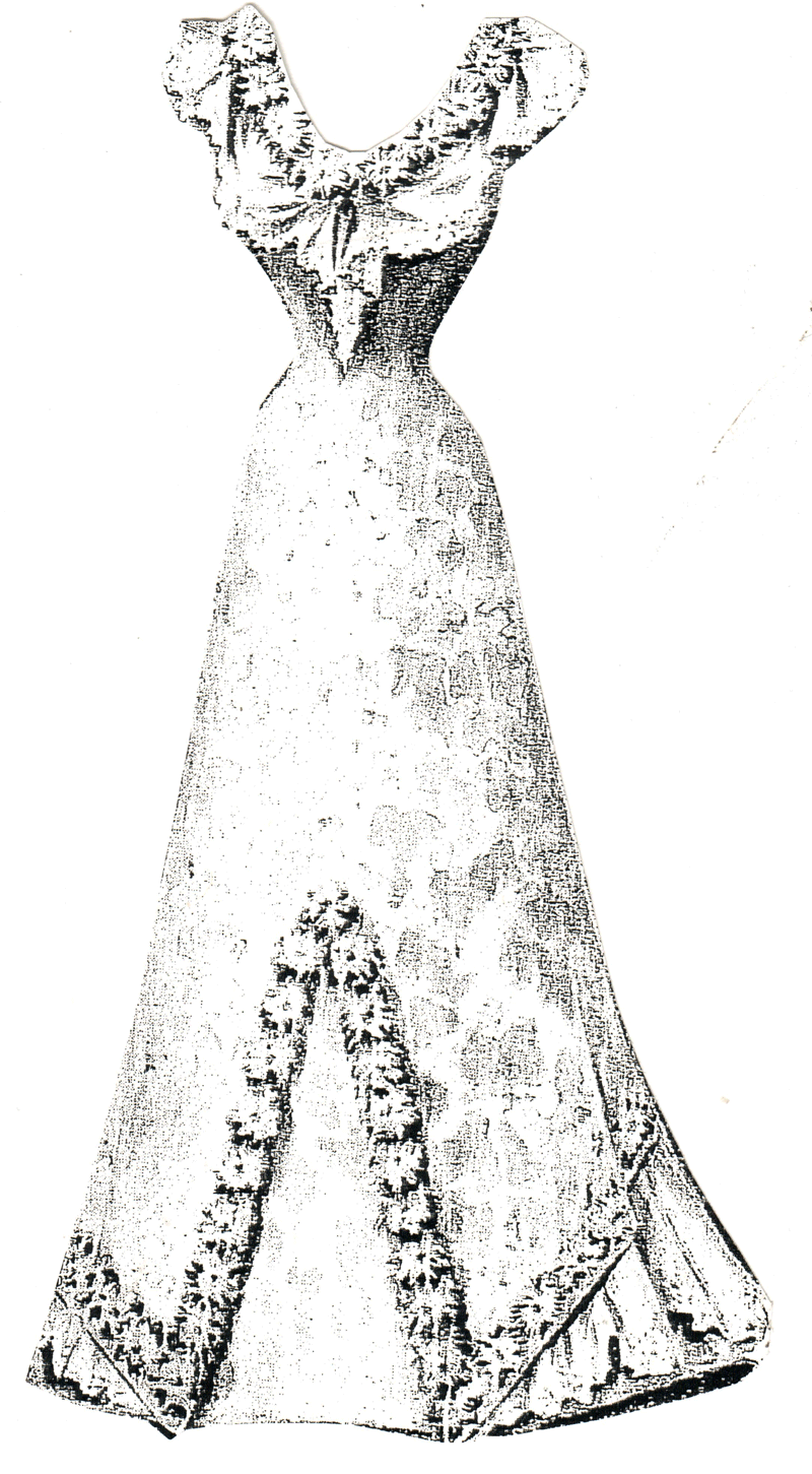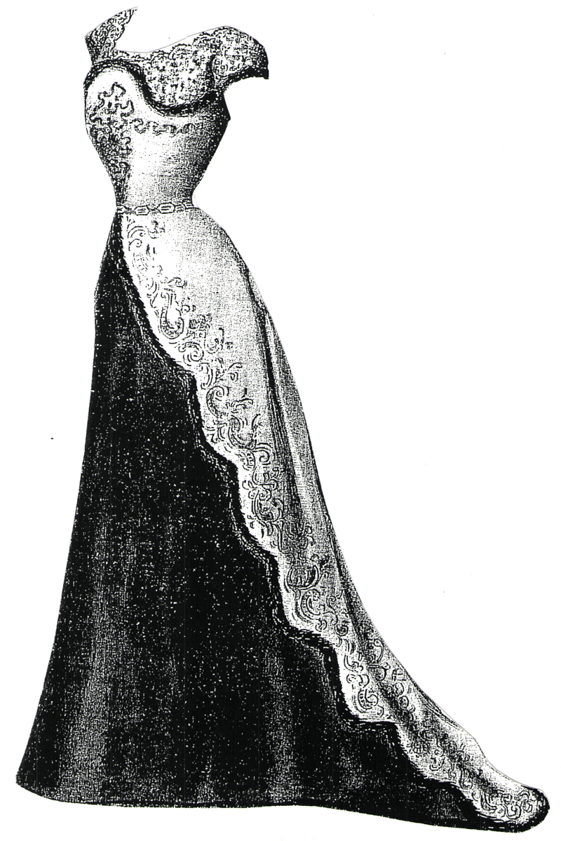 chrysanthemums and consists of bodice, skirt and lace drapery.