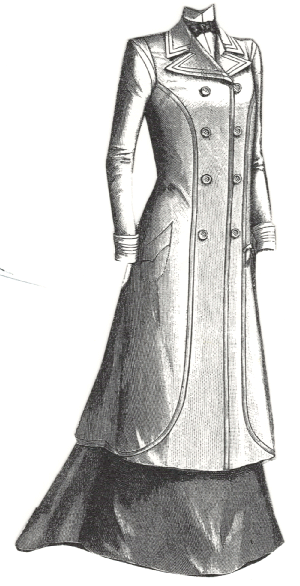 This great coat, in light fashion sheet, is lined with lilac taffeta, adorned with narrow strips of the taffeta and is closed in front double breasted, with large buttons and loops. English translation and original French sewing instructions included.