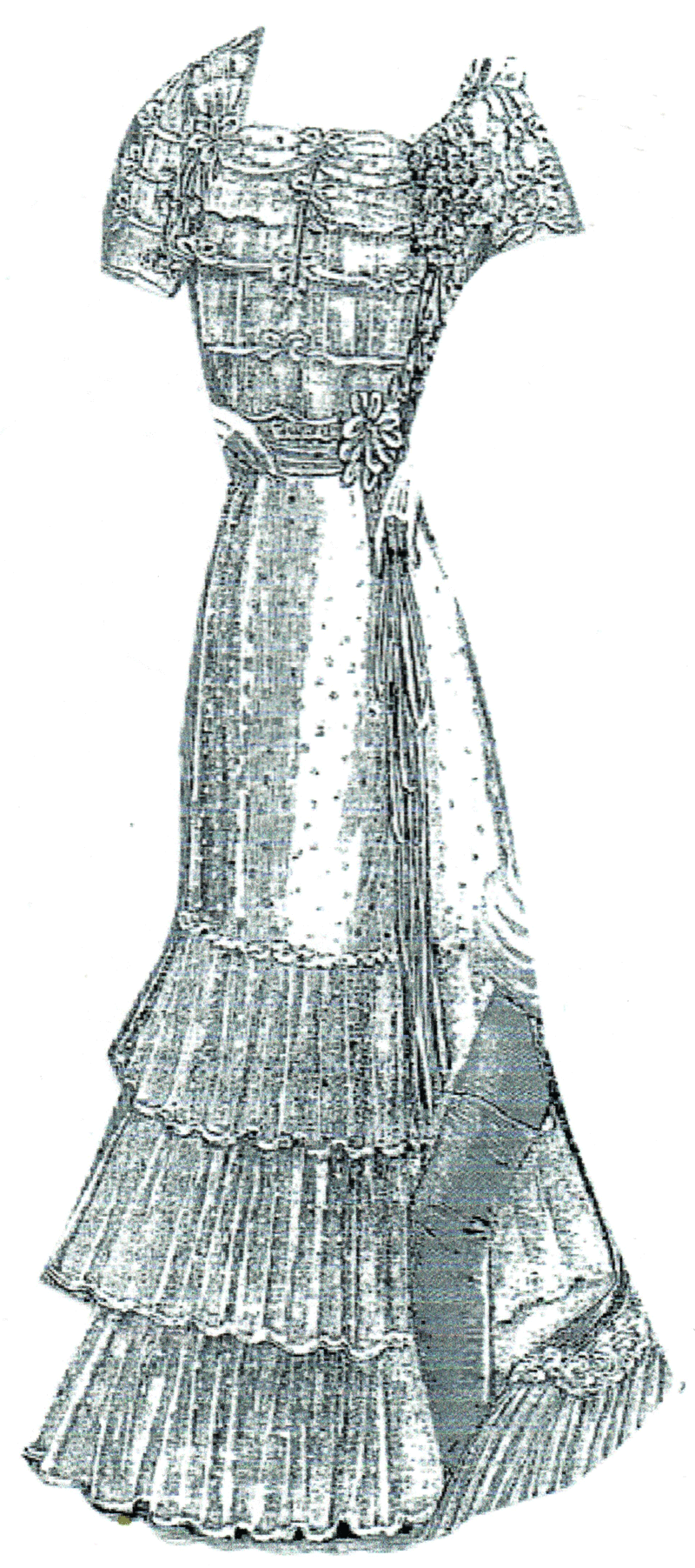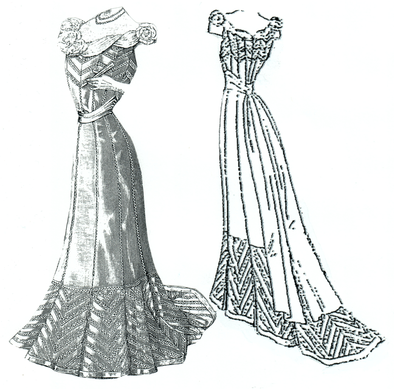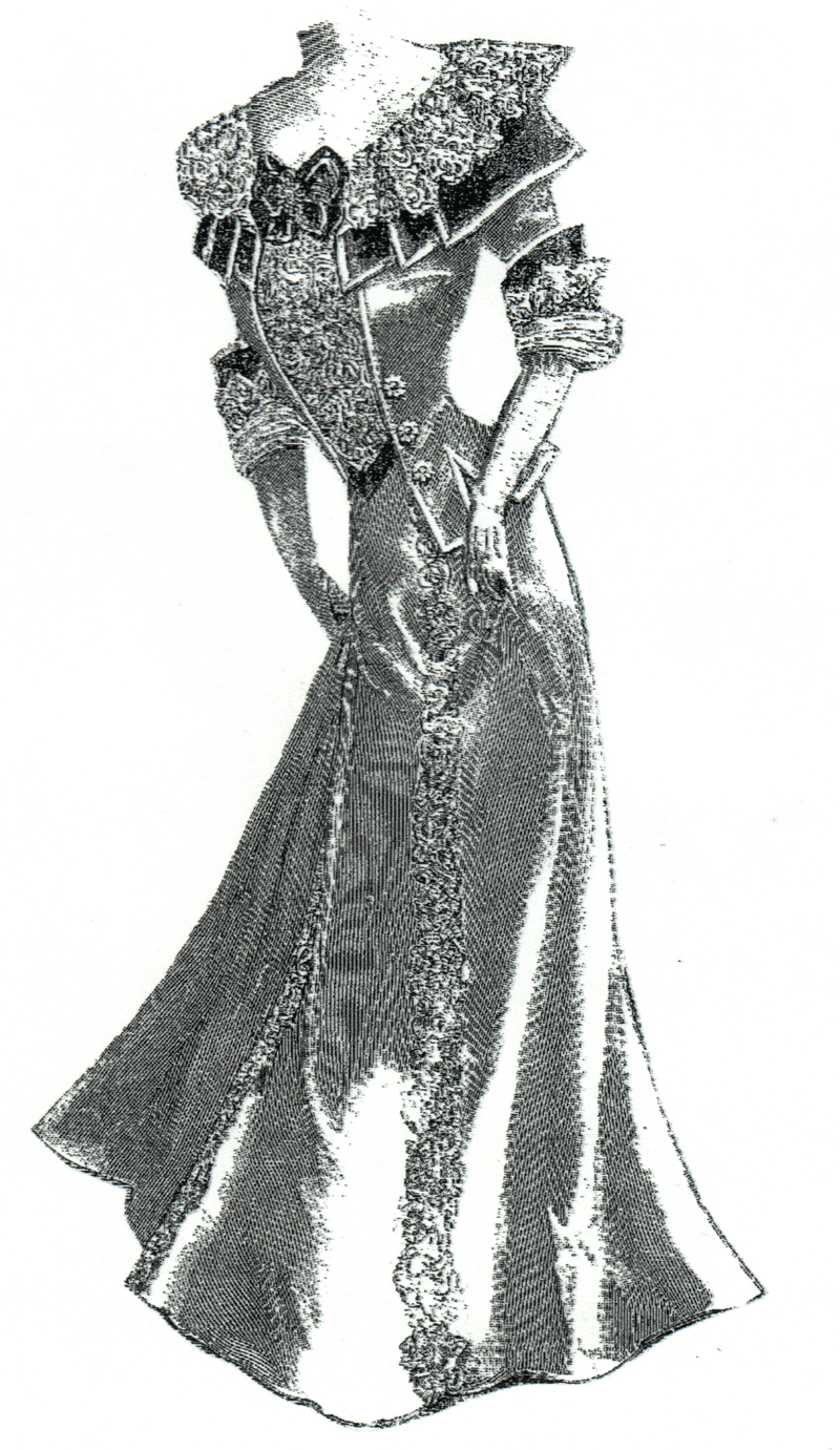 almond green silk, decorated in front with lace insertion and Venetian lace. English translation and original French sewing instructions