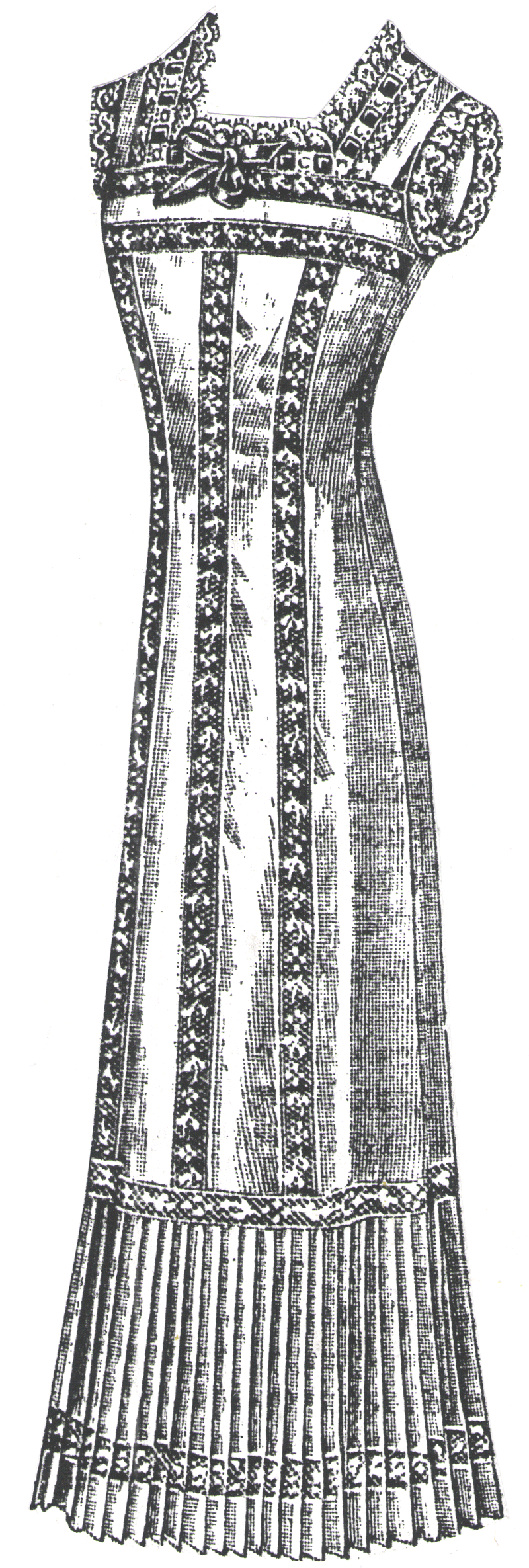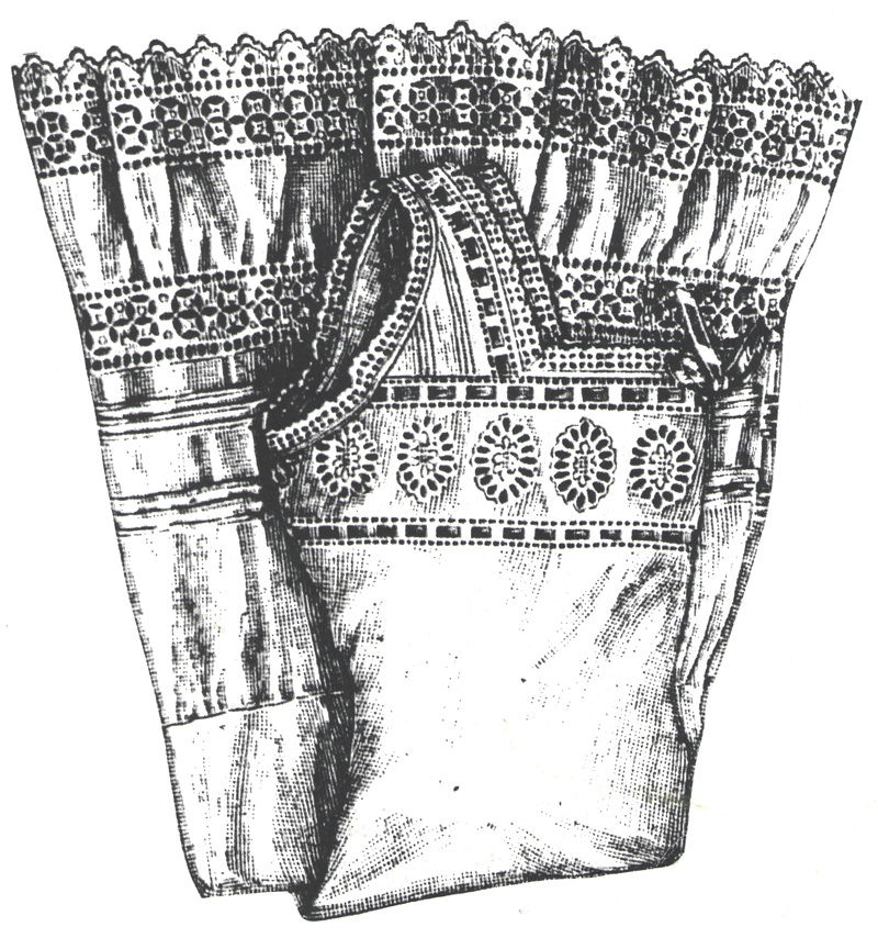 trimmed with lace insertion and a pleated flounce. English translation