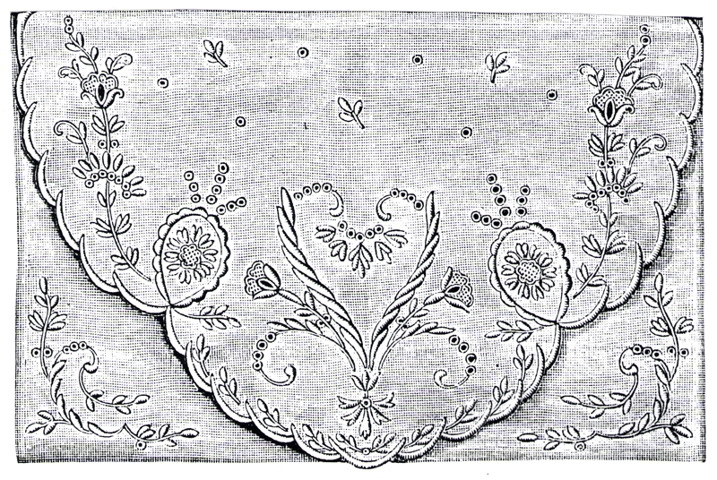 flap are edged in scallops. The embroidery, a very decorative effect,