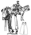 with a tight bodice and a short skirt divided in front and looped, or drawn