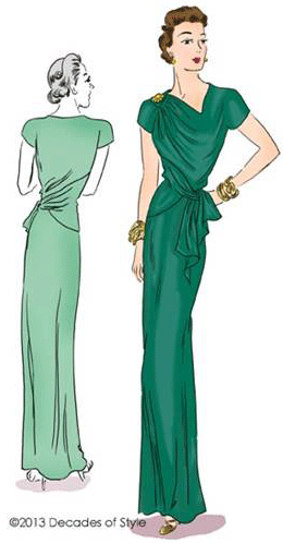 pleated into the right shoulder. Back bodice extends to front at