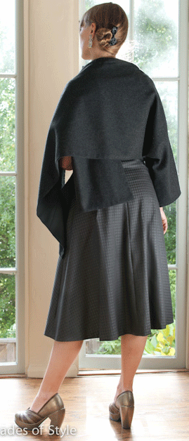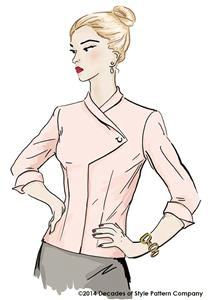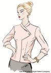 blouse with asymmetrical front opening. Bust and waist darts. Shawl