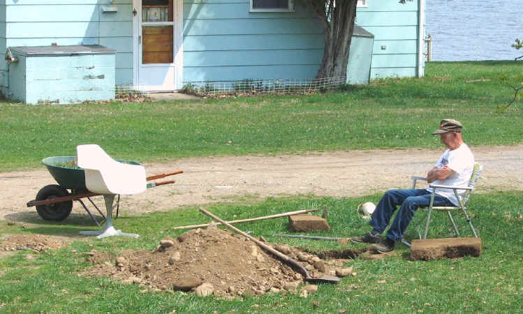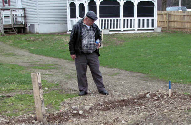 Before I return to Winston Salem, Hal and I take a drive to check on home. Hal inspects the stakes from the new water system being installed.