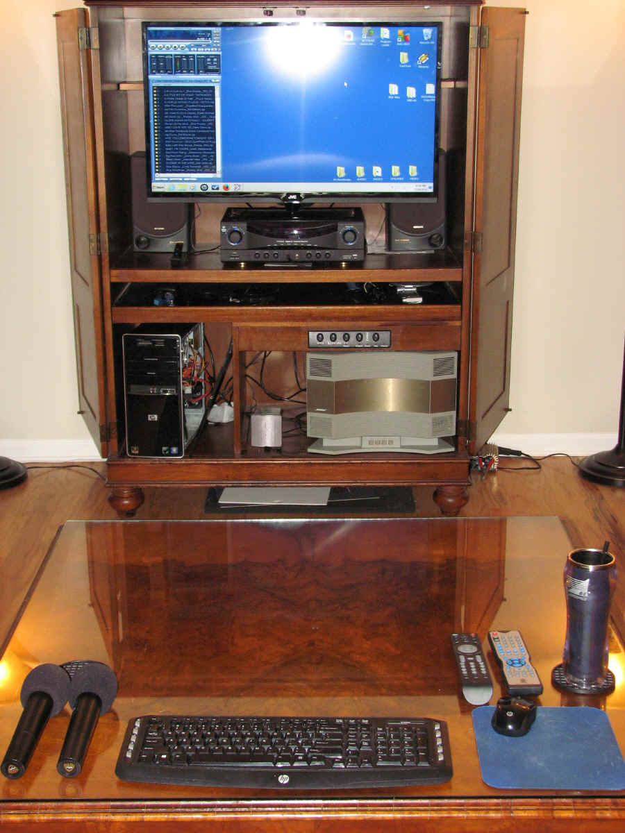 Glass on coffee table in front of Entertainment Center w/Karaoke (Computer is in process of new programming)