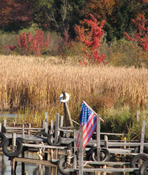 And finally, a picture taken at Jones Marina................... As I did not run, I extended my walk down Kiblin Shores Road out to Rt 15 towards Rt 3. At the Marina, with the Fall foliage in the background, and within the empty docks in the foreground, Old Glory was waving as proud as ever in these trying times. It was a memorable walk.