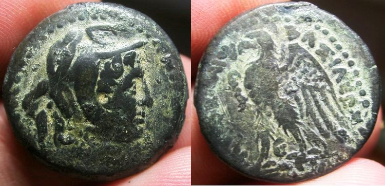 Egyptian Bronze Coins of Alexander Ptolemy, a successor General of Alexander, and Ptolemy's heirs, also minted bronze coins with Alexander's image. The Ptolemaic empire was founded by Ptolemy I after the death of Alexander the Great. Ptolemy I was a boyhood friend of Alexander and his most trusted general. After Ptolemy successfully completed the Persian war, Alexander granted him the area of Egypt. He founded an empire that lasted almost 300 years. The empire ended with Cleopatra VII, the Queen of the Nile. These coins were minted starting shortly after Alexander's death and before Ptolemy assumed the reign as King (Pharaoh) of Egypt, but, continued about 100 years. Most of these bronze coins are about 16 to 27 mm diameter (about the diameter of a US Penny, up to larger than a US Quarter and typically twice as thick). Like his tetradrachms, most of Alexander's bronze coins feature Alexander's portrait wearing a Elephant skin cap. The reverse scene is typically the Ptolemaic Eagle and a legend indicating the Ptoelmaic Dynasty in Greek.