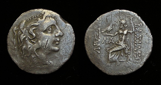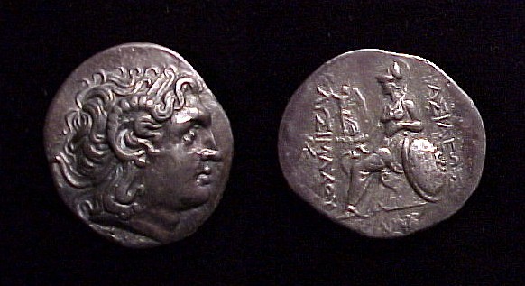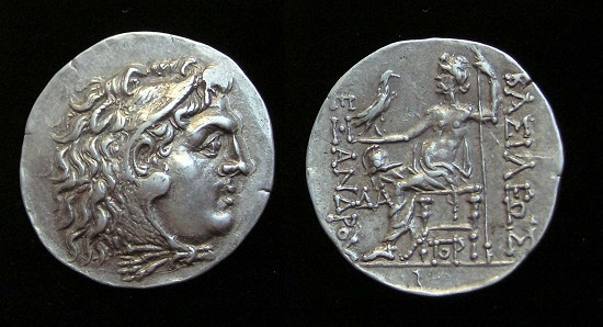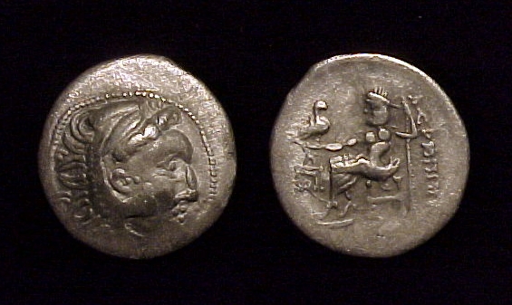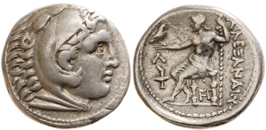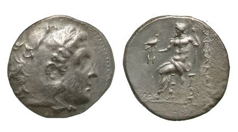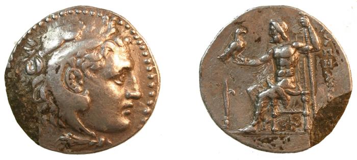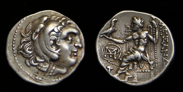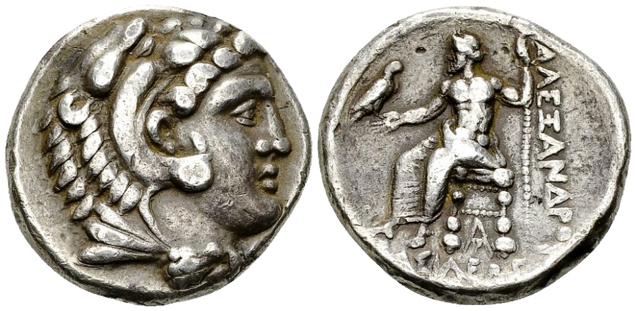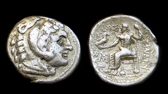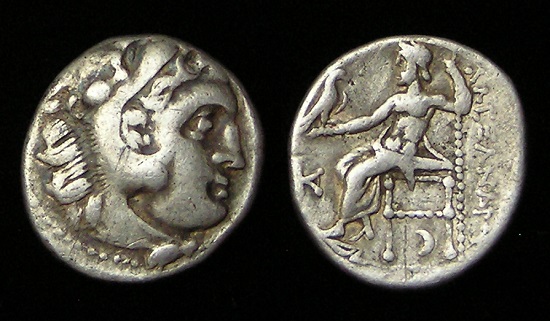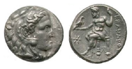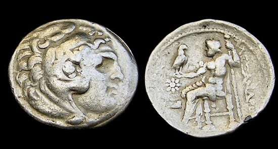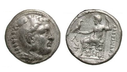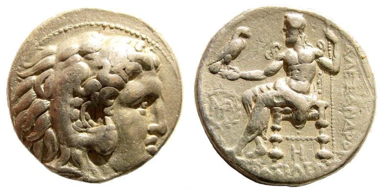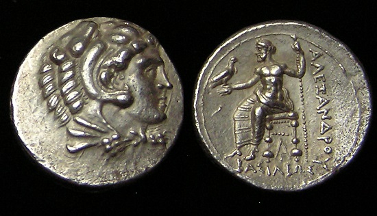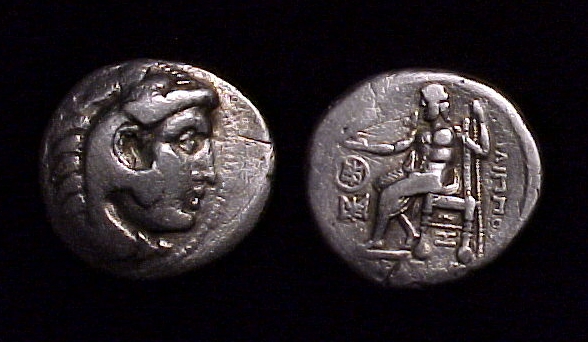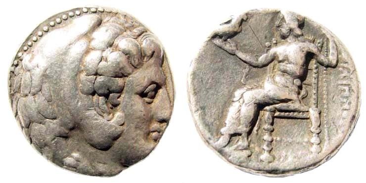 Drachm Coins of Alexander Drachms are medium sized silver coins (1/4 the weight of tetradrachms). Most weight about 4 grams and measure about 16 to 19 mm diameter (about the diameter of a US Dime and twice as thick). These are thematically identical to Alexander's tetradrachms (above) and feature Alexander's portrait as Herakles (same as Roman Hercules). He is wearing a Lion Skin. The Lion Skin is from the Nemeaen Lion killed by Herakles with his bare hands. The reverse scene is Zeus, seated, holding an eagle in his outstretched hand and a legend bearing his name in Greek. When Alexander conquered territories, he looted the conquered kingdoms precious metals, gold and silver (i.e., plunder). He, and his successors, minted coins in his name with that plunder. These coins are the plunder of Alexander the Great.