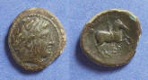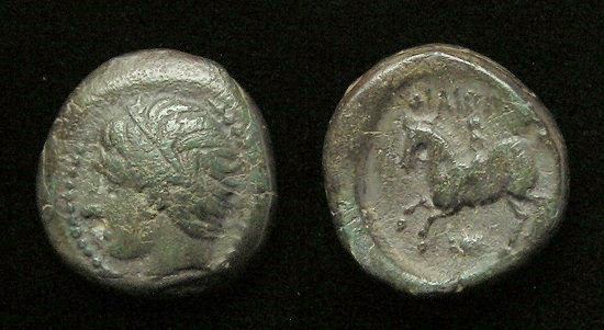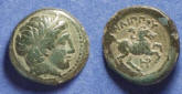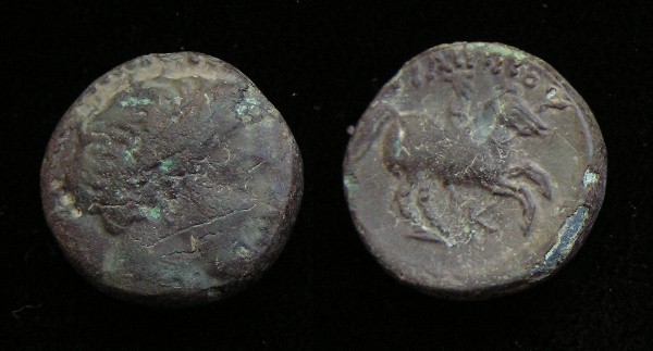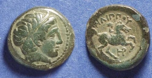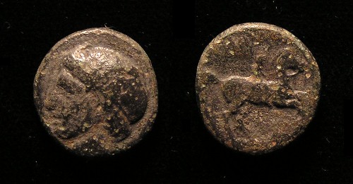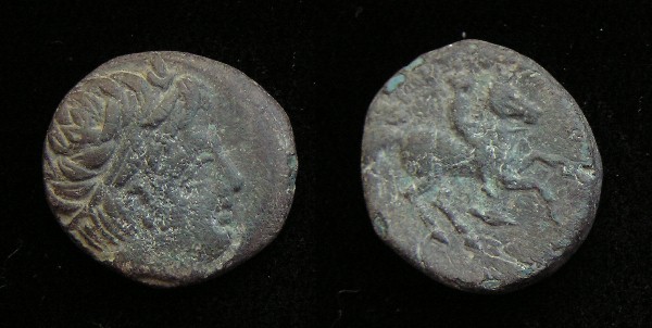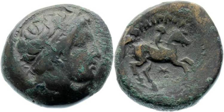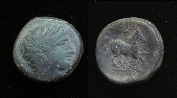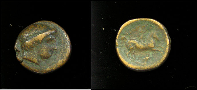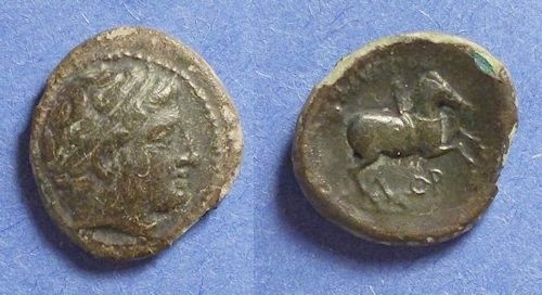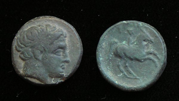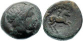 #11067: Bronze – 350 BC, Commemorates an OLYMPIC GAMES VICTORY !! Pretty !! Historical Context: This coin was minted by the MACEDONIAN EMPIRE (494 - 168 BC) during the reign of Philip II. When Philip II was young he won two Olympic equestrian victories. His coins often commemorate those victories. This reverse of this coin shows Philip II's jockey on horseback. Some believe the reverse is intended to be Alexander the Great (as a boy) on Horseback, referring to a challenge that Philip issued to Alexander regarding riding a certain horse. Obv: Apollo (Very Artistic representation) SOLD $69.95 plus shipping