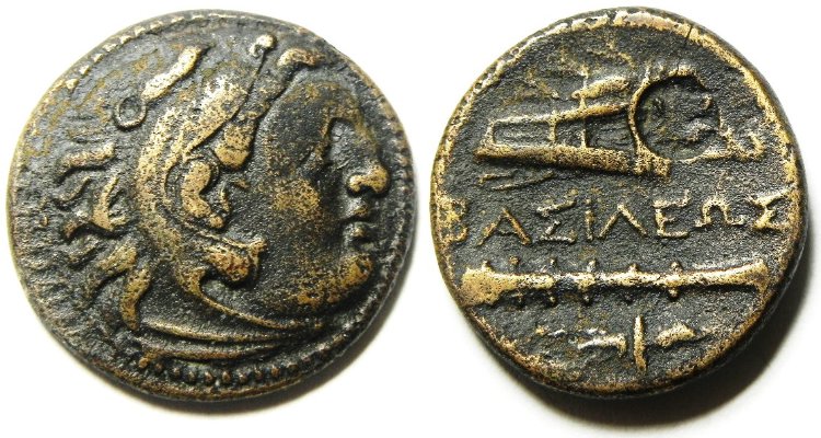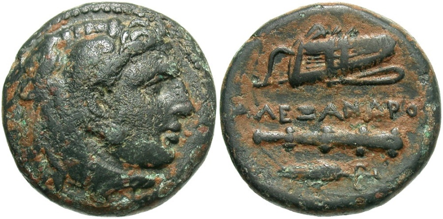Bronze Coins of Alexander within the Macedonian Empire Alexander, and his successors also minted bronze coins. Most of these bronze coins are about 16 to 19 mm diameter (about the diameter of a US Penny and typically twice as thick). Like his tetradrachms, most of Alexander's bronze coins feature Alexander's portrait as Herakles (same as Roman Hercules). He is wearing a Lion Skin. The Lion Skin is from the Nemeaen Lion killed by Herakles with his bare hands. The reverse scene is typically the club and/or the bow case of Herakles and a legend bearing his name in Greek.