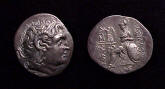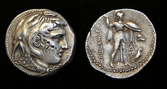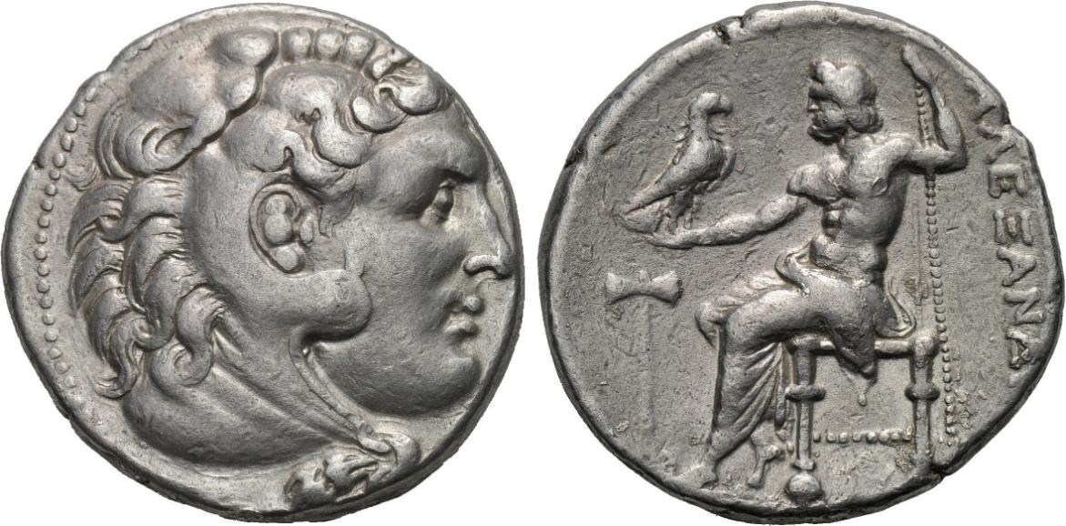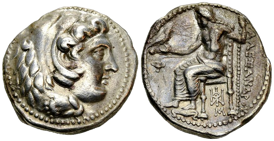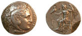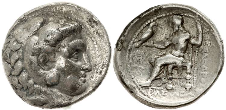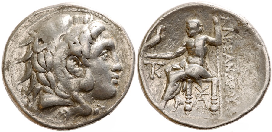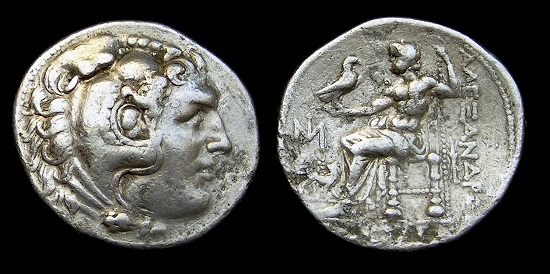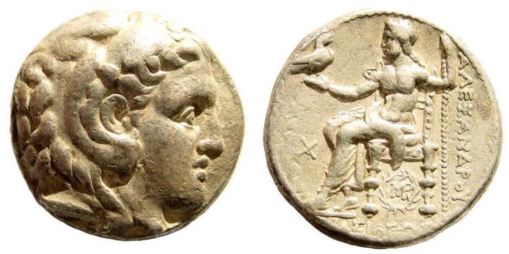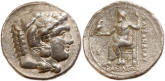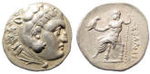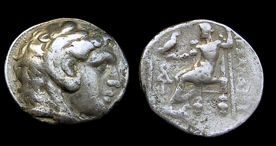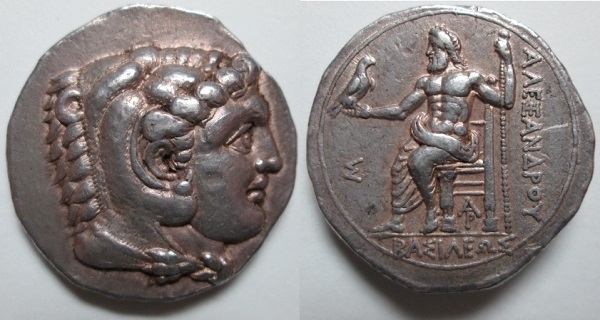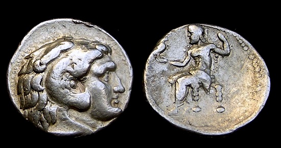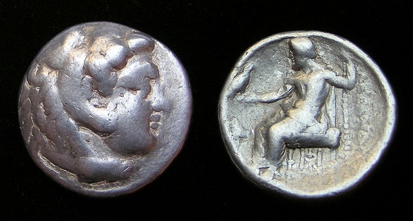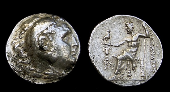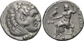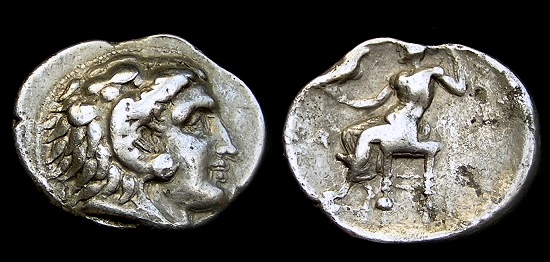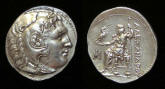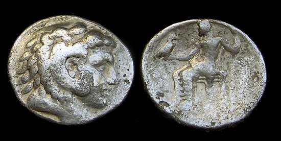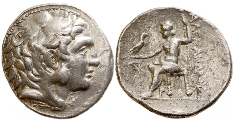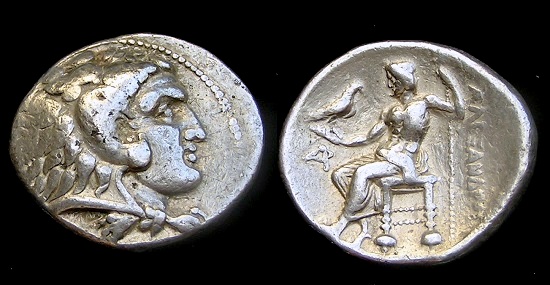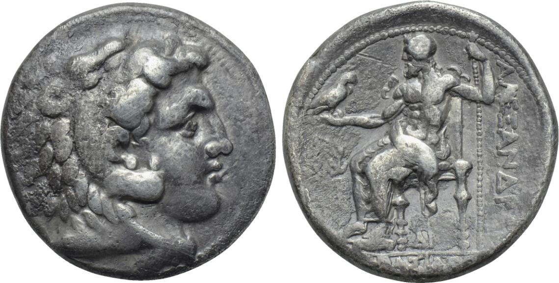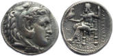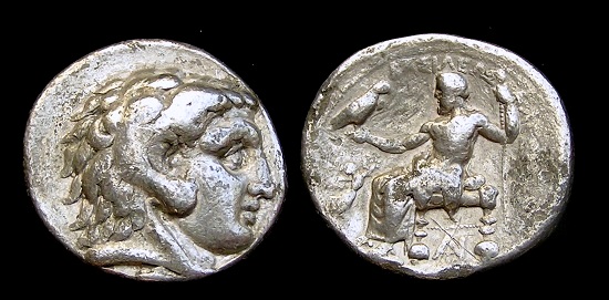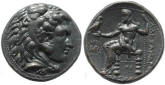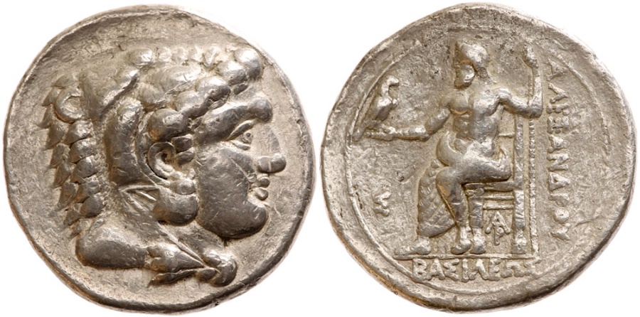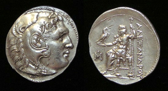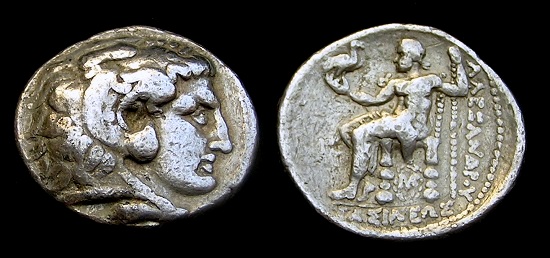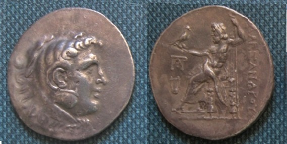 Herakles-type Tetradrachm Coins of Alexander Tetradrachms are large silver coins. Most weight about 17 grams and measure about 24 to 30 mm diameter. The smaller diameter type (24 to 26 mm) are about the diameter of a US Quarter but 2 to 3 times as thick. The larger diameter type (27 to 30 mm) are about the diameter of a US $.50 but twice as thick. Alexander's tetradrachms and drachms features Alexander's portrait as Herakles (same as Roman Hercules). He is wearing a Lion Skin. The Lion Skin is from the Nemeaen Lion killed by Herakles with his bare hands. The reverse scene is Zeus, seated, holding an eagle in his outstretched hand and a legend bearing his name in Greek. When Alexander conquered territories, he looted the conquered kingdom's precious metals, gold and silver (i.e., plunder). He, and his successors, minted coins in his name with that plunder. These coins are the plunder of Alexander the Great.