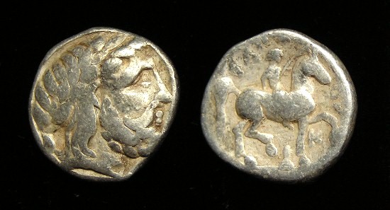 #8805: CELTIC Silver Tetradrachm-340 BC, Copy of Macedonian Empire - Philip II Father of Alexander the Great !! Commemorates his Olympic Victory !! Historical Context: See above Obv: Philip II as Zeus BUY NOW $239 plus shipping