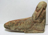 #9825 Mehrgarh period, 3rd Millennium BC Historical Context: The civilization who created these figures at Mehrgarh, Baluchistan, a province of Pakistan, are considered to be the most ancient civilization in all of Asia and is one of the most important Neolithic (7000 BC to 3200 BC) sites. Mehrgarh lies on the "Kachi plain of Balochistan, Pakistan, and is one of the earliest sites with evidence of farming (wheat and barley) and herding (cattle, sheep and goats) in South Asia.". The earliest settlement at Mehrgarh—in the northeast corner of the 495-acre site—was a small farming village dated between 7000 BC–5500 BC. Most human figurines found in the ruins of that culture are feminine which indicates that women had a high standing in that society. Description: Buff terracotta figurine of seated naked