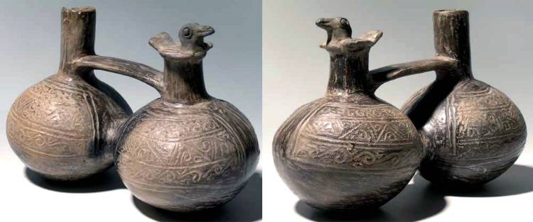 Chimu Zoomorphic Whistle Bottle vessel A fine Chimu Zoomorphic Whistle Bottle vessel from Peru, c. 1100 – 1450 AD. This fine example is 5 1/2” high and 8 1/2" long and features a nicely detailed bird nesting atop the front chamber. The chambers are connected and both are decorated with deeply incised designs. In excellent condition, with good mineral deposits. Ex Sarmiento collection Attribution: Peru, 1100 to 1450 AD Size: 5-1/2-inch high and 8-1/2-inch long Condition: Excellent condition, with good mineral deposits. - Please see the picture. BUY NOW $549 plus shipping |