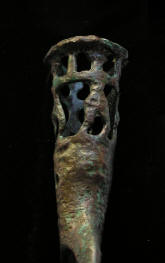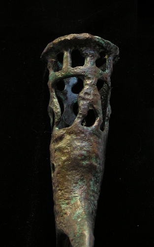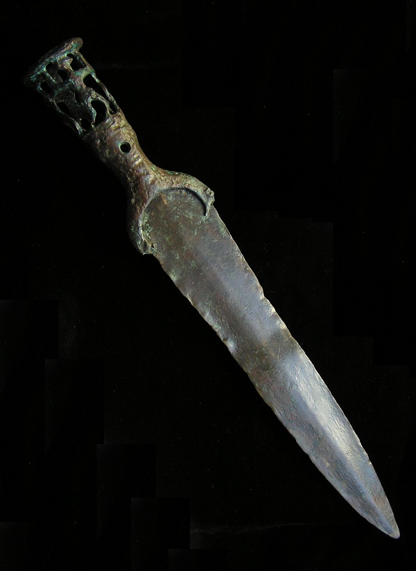 Historical Context: Luristan literally means “Land of the Lurs”, and was situated in a wide sweep of the Zagros mountains in what is now western Iran. The sociopolitics of this area are complex, with repeated waves and invasions of Medes, Cimmerians and Persians, amongst others. There are many styles, but the best-known pieces of bronze from this area are anthropomorphic and zoomorphic pieces reflecting religious and secular tastes, as well as weaponry and utilitarian items that were buried with the deceased in tombs across the Zagros area.