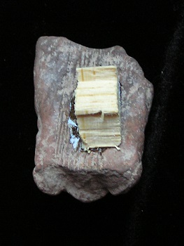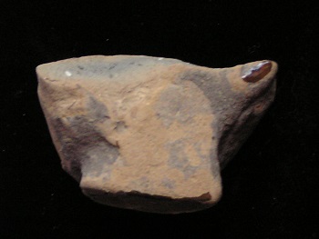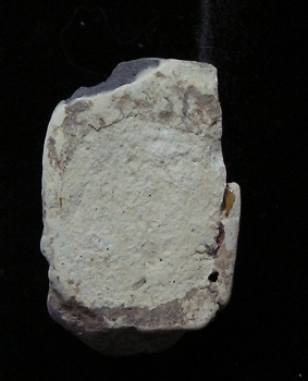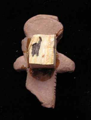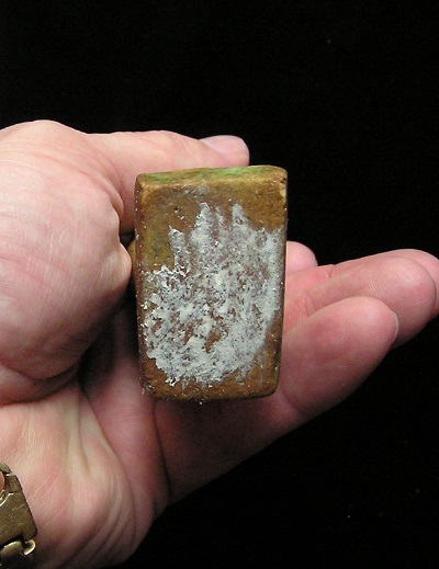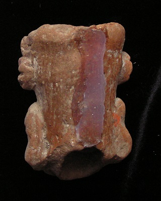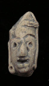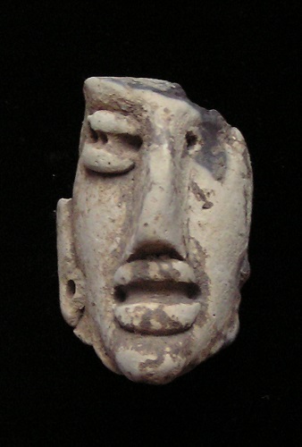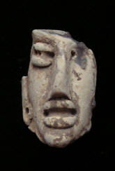 Statue face fragment Size: 1-1/2-inch tall Condition: Excellent condition, with good mineral deposits, Stable NOTE: A group MesoAmerican antiquities recently aquired were mounted in a shadow box. Substantial residual glue (resin or silicome adhesive) used in the mounting is on the back of this piece. BUY NOW $89.95 plus shipping Photo of back |