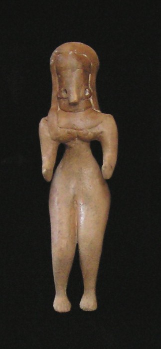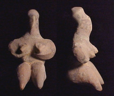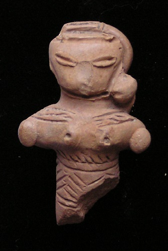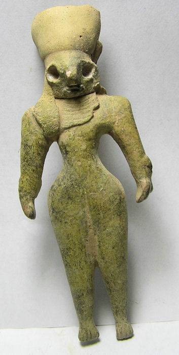 #9658 Mehrgarh period, - Fertility Goddess 3rd Millennium BC Historical Context: The civilization who created these figures at Mehrgarh, Baluchistan, a province of Pakistan, are considered to be the most ancient civilization in all of Asia and is one of the most important Neolithic (7000 BC to 3200 BC) sites. Mehrgarh lies on the "Kachi plain of Balochistan, Pakistan, and is one of the earliest sites with evidence of farming (wheat and barley) and herding (cattle, sheep and goats) in South Asia.". The earliest settlement at Mehrgarh—in the northeast corner of the 495-acre site—was a small farming village dated between 7000 BC–5500 BC. Most human figurines found in the ruins of that culture are feminine which indicates that women had a high standing in that society. Description: Buff terracotta figurine of seated naked